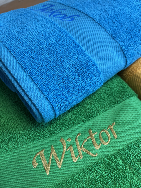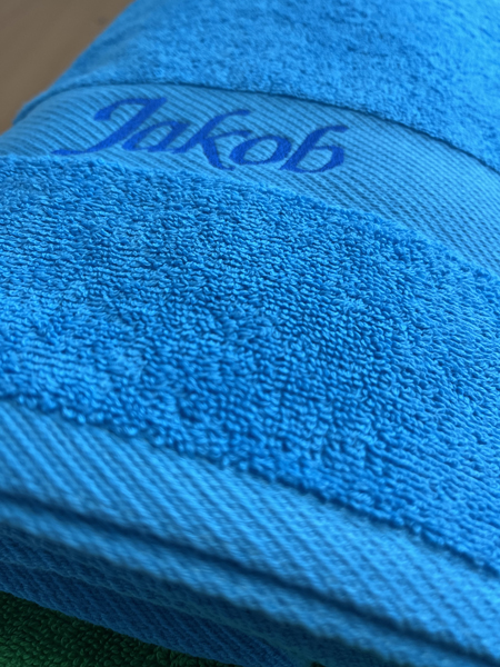 Handtücher mit Namensbestickung: Die Beschriftung (Vorname, Name, Wunschtext, Spruch o.ä.) wird mit ca. 2,5cm Buchstabenhöhe gestickt. Maximale Sticklänge beträgt 30cm. Falls der Sticktext länger als 30cm ist, so wird die Buchstabenhöhe verringert damit die maximale Sticklänge von 30cm eingehalten werden kann.